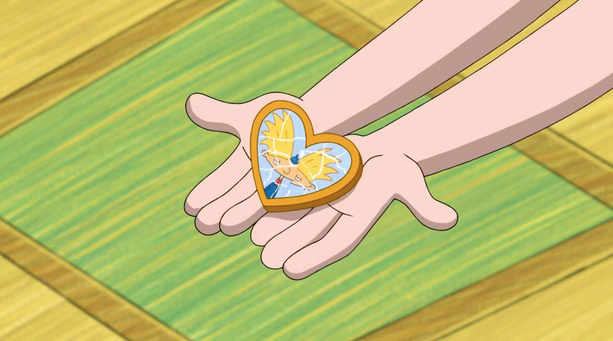Helga has the phrase "Arnold, my soul. You are always in my heart. Love, Helga G. Pataki" inscribed inside it (the inscription is shown in black, for animation process reasons).