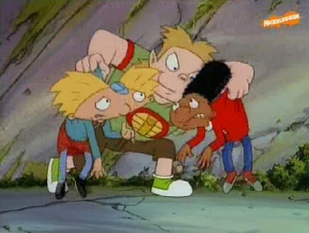Helga and Sid run off in another direction while Gerald and Arnold wonder what they can do because the streets are filled with 5th graders. The two are greeted by the mysterious Mickey, who has agreed to help them at a cost. Arnold gives him a yo-yo and dog toy and he accepts them. Mickey leads Arnold and Gerald through the streets, and they constantly hide from Wolfgang, Edmund and the other 5th graders. Mickey finds a wooden dolly in one of the buildings and has Arnold and Gerald lie on it with a sheet covering them. Mickey wheels them to another location and when the sheet is taken off, Arnold and Gerald find that he's led them straight to Wolfgang and the 5th graders! Arnold yells at him for tricking them and Mickey, who is a 5th grader himself, replies with a laugh, "They don't call me the Weasel for nothing!".